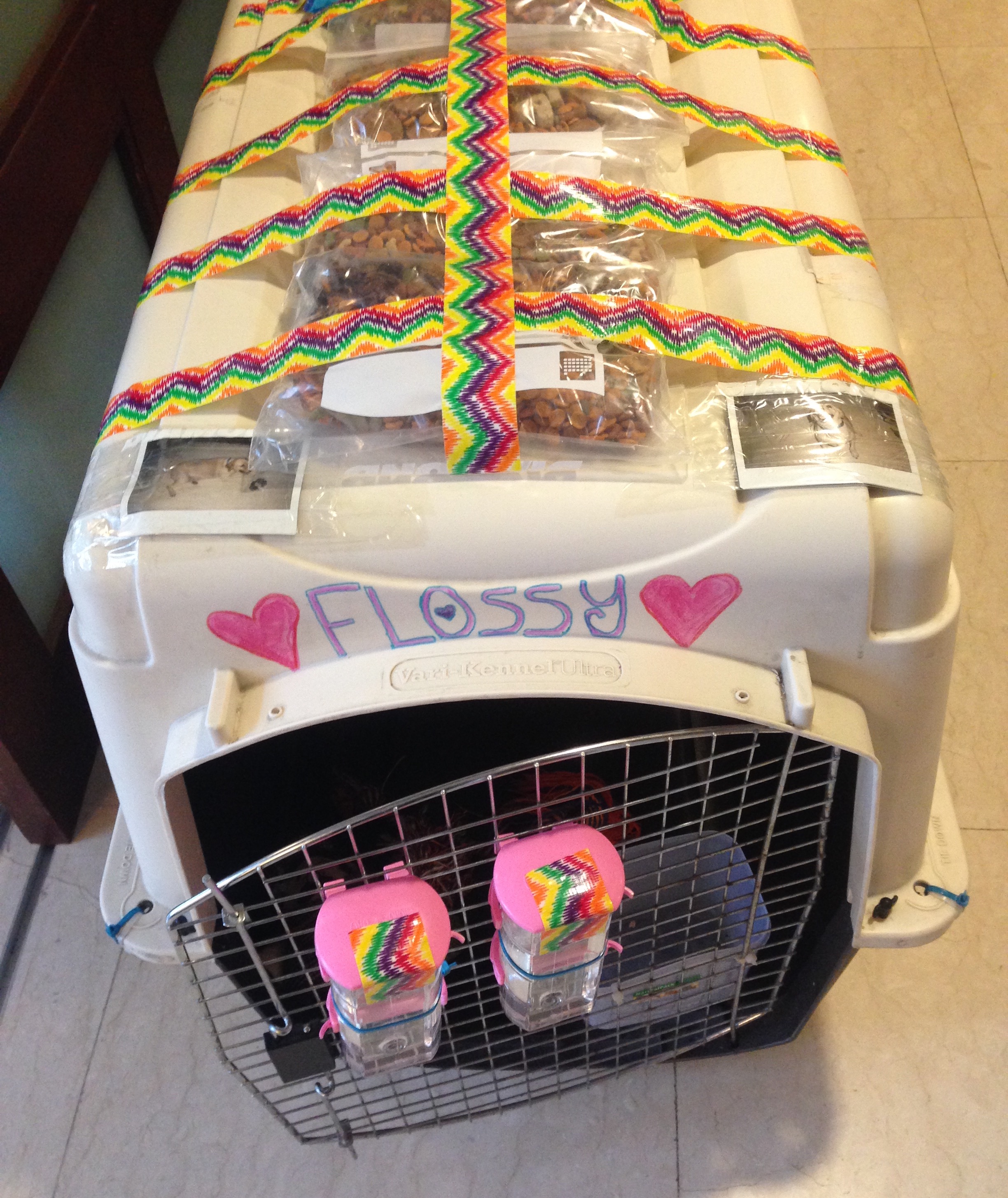 I also decorated the front of her crate with her name. I wanted her handlers to know her name in hopes that it might comfort her along the way. According to my mom, when Flossy arrived in Dulles everyone around her was calling her by name and she was wagging her tail right and left!