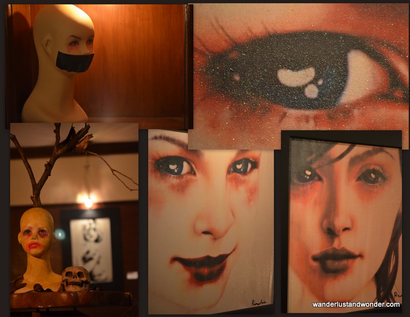 Laced through the trees were windows of all kinds each decorated in a unique style.  These windows were formed out of found objects and discarded window frames and gave the venue a whimsical charm.  While the main Pavillion held Rizal Fadillah’s exhibition titled, Mudah Retak! (“Frangible!”).    The mixed media paintings were dark and haunting portraits of young women in pain.  With a focus on the eyes, because as Rizal explains, “The eyes can’t lie”  each girl  conveyed the profound agony of suffering a broken spirit.  “Everyone is breakable” noted Rizal.  And the concept that one who is emotionally broken, will in turn feel useless, is one that runs deep in each work.  Rizal confided, “Before you paint you must cut off your head, and use only your heart”.  This emphasis on emotion and concentration on communicating extreme anguish produces a visceral response in the viewer, who can’t help but vicariously experience the subject’s inner torment too.