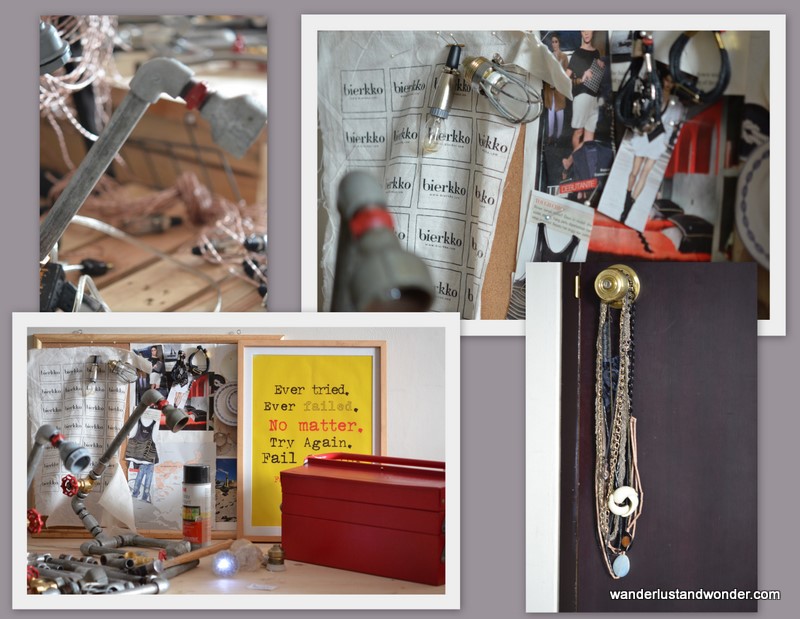 Sitting in their workshop, surrounded by their industrial parts and prototypes, it’s easy to see why the team is in heavy demand. Their bracelets and necklaces, created from clips, cord, key chain parts and even bolts and brass hinges are reminders that you don’t need great wealth to have great personal style. Just as their lighting fosters and edgy atmosphere, their accessories too create an air of industrial drama, that is at once charming and alluring.