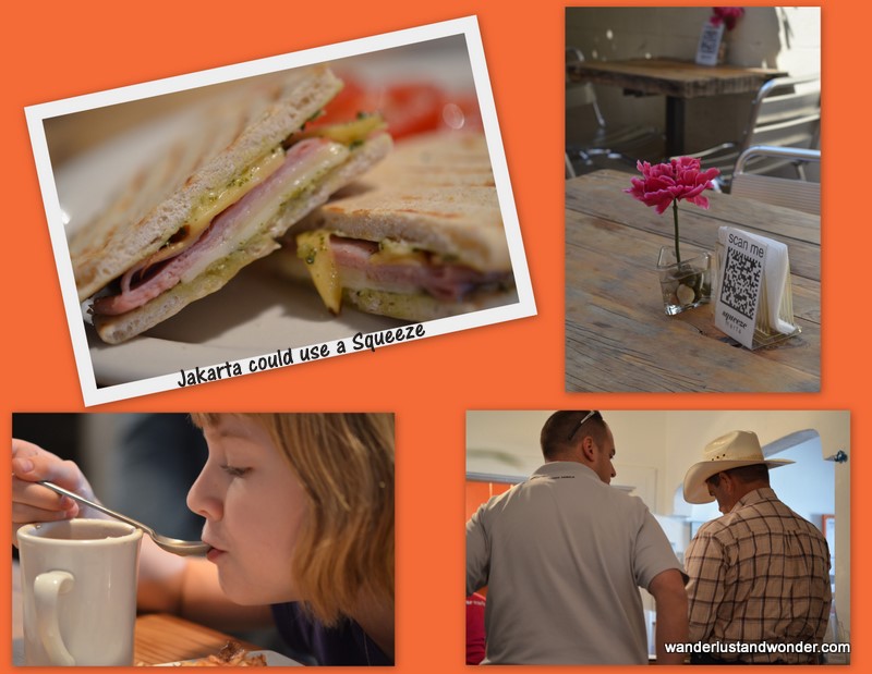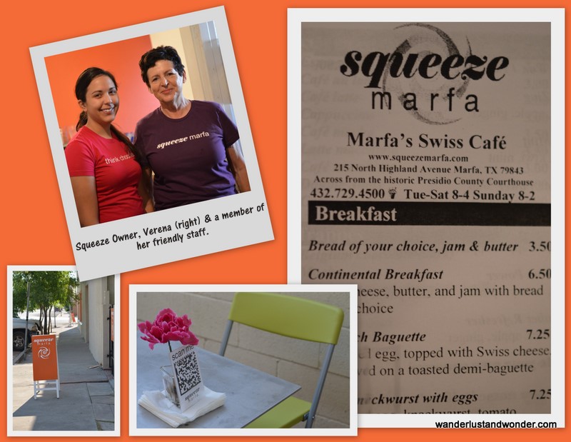 In doing research for an upcoming magazine article on the wonderful city of Marfa, I had the pleasure of meeting Verena Zbinden-Vollenweider, owner of Squeeze Marfa. Squeeze is a charming swiss café in the middle of West Texas. Verena has created a menu that makes venturing out for breakfast entirely worth the trip. Fresh coffee, waffles topped with chocolate and whipped cream, and deliciously creative sandwiches are among the tasty offerings Verena whips up everyday.