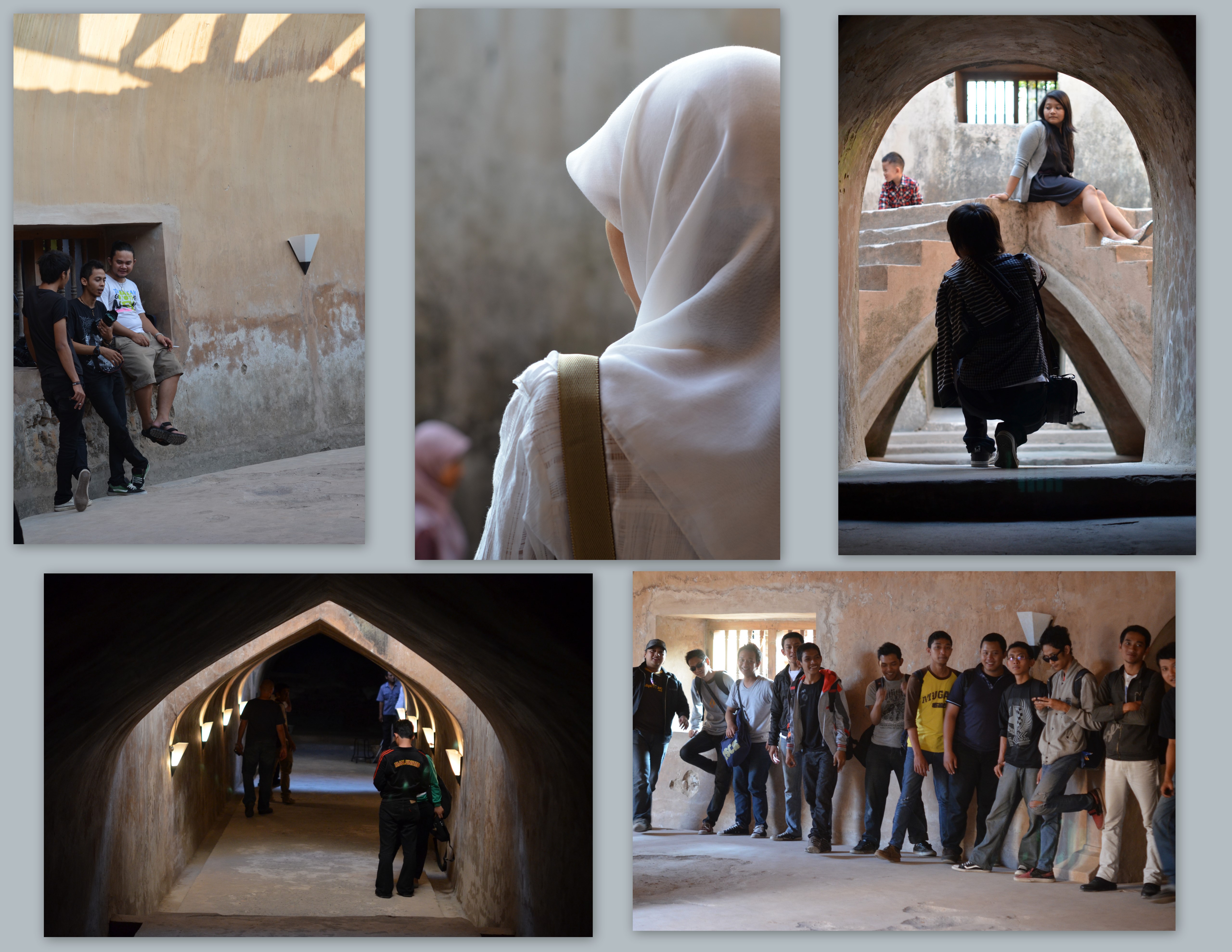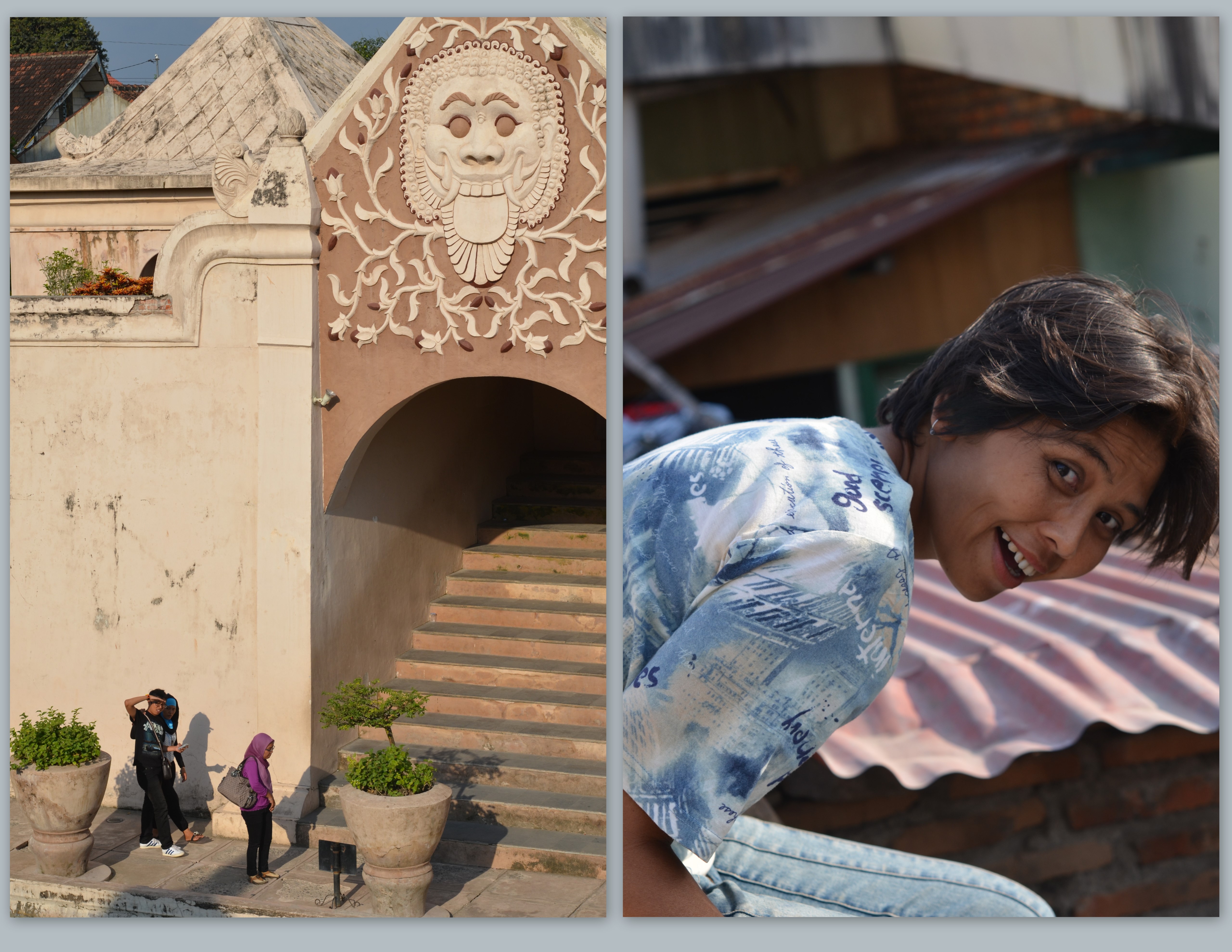 Perhaps I should explain these pics. They were taken at Tamansari. As I was wondering around the lady on the right came up and told me if I wanted a good view I should follow her. I wasn’t really sure what I was getting myself into, but I followed her around her house and to a wall that was indeed adjoining the Sultan’s pool. I climbed up and sure enough, there was a great view. Also a semi-scary view, if you, like me, are afraid of heights. I looked down and then immediately sat down as I didn’t want to become the dumb tourist that fell off a wall and into the Sultan’s pool. The guy on the left is probably wondering why there is a crazy lady on the wall looking like she might jump….good times.