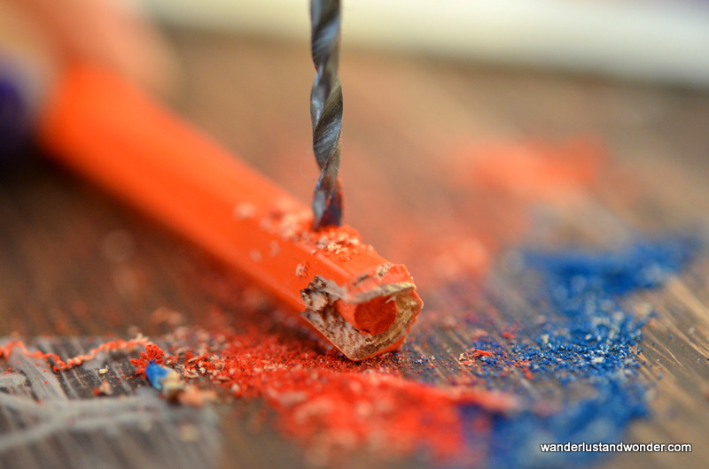Step Three: Drill a hole about a half inch from the end of your pencil…
