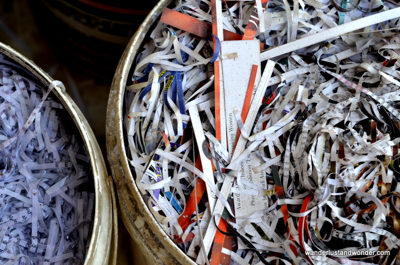 Discarded paper is something that is ubiquitous in modern life. Whereas some artists have to search out and purchase expensive paints and brushes, the materials for Kis’s work seem to find him. When Kineforum received 1,000 entries for a novel writing contest they sponsored, and due to copywrite laws they had to shred the losing entries, they called Kis and he received tens of thousands of shredded sheets of paper which he then turned into chairs and racks.