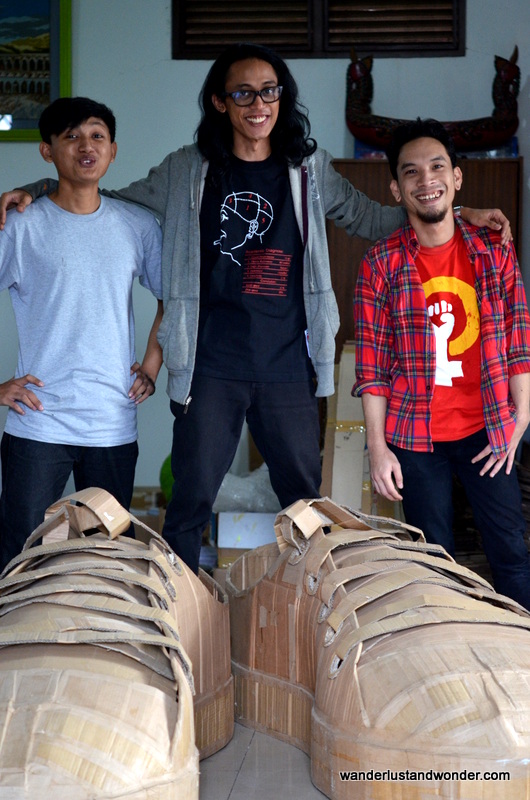 The objects Kis and his paper-loving community make are sold through their Facebook page, “Toko KPK.” The group has about 20 active members. Kis points out: “Anyone can join our community. Many members come from backgrounds in management or communication. They make our point of view broader and their perspective makes us better.” Together the group works to create art objects with an interactive component. The notion of erasing the boundaries between art and life is something Kis wholeheartedly embraces in his personal art projects, and advocates in his community endeavors: “I want to get as close to people as possible to deliver my message. If you want to take the shortest amount of time you need the shortest distance too. That’s why people can touch and interact with my work.” He encourages people to sit in, or “try on” his giant cardboard shoes, and with his community he creates beautiful and surprisingly durable objects that make us re-envision what the role/purpose of paper can be.